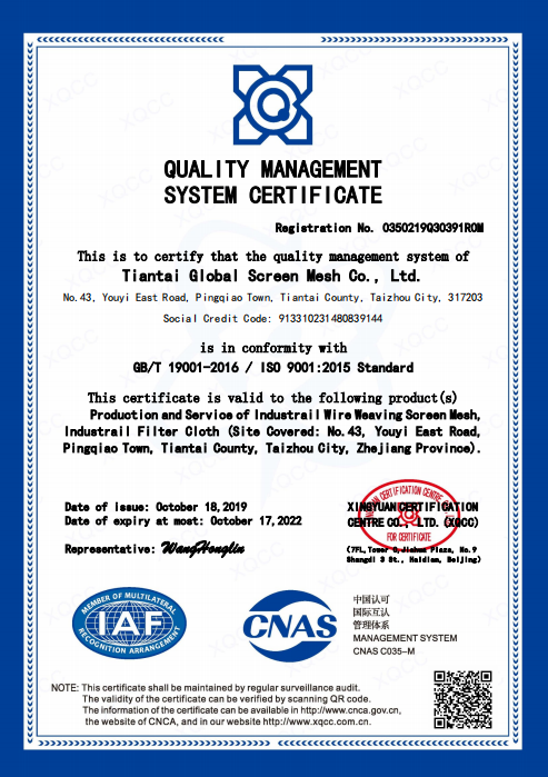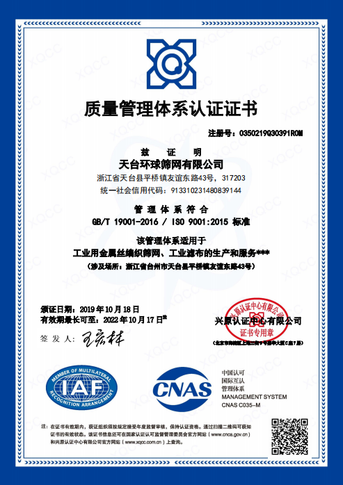 天臺環(huán)球篩網(wǎng)有限公司,成立于1995年,座落在東海之濱美麗的天臺山腳下,注冊資金500萬人民幣,公司已通過ISO9001:2015國際質(zhì)量體系認證。經(jīng)過環(huán)球人的不斷努力,目前公司已擁有標準廠房10,000平方米,各種篩網(wǎng)設(shè)備近100臺,員工100余人,其中高中級科研及管理人員10人,公司產(chǎn)品主要有:不銹鋼網(wǎng),銅網(wǎng),電焊網(wǎng),電焊網(wǎng)片,軋花網(wǎng),不銹鋼延伸產(chǎn)品,單復(fù)絲濾布,濾布袋,壓濾機袋等。